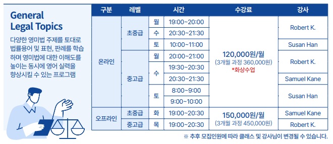 1. 귀 회원의 평안하심을 기원합니다.? 2. 협회는 회원들이 쉽게 Legal English 의 핵심표현을 익히고, 국제법률서비스의 다양한 Case Study & Research를 통하여 실무능력을 향상하는데 도움을 드리고자 아래와 같이 「Business & Legal English」 과정을 실시하고자 하니, 수강을 희망하시는 회원께서는 2025. 12. 23.(화)까지 신청하시기 바랍니다. 3. 본 과정은 온라인 또는 오프라인으로 진행되며 의무연수 중 전문연수 시간이 인정됩니다. - 아 래 - ? 기 간 : 2026. 1. 5.(월) ~ 2026. 4. 3.(금) / 12주 과정 ? 장 소 : SPEP CENTER 강의실 또는 화상수업(ZOOM 프로그램 안내 예정) ※ SPEP CENTER 강의실 (서울 강남구 언주로 861) ? 교육내용 및 수강료 (주 1회)  ? 수강인원 : 클래스별 8~10명 (수강료 입금 순으로 접수함.)